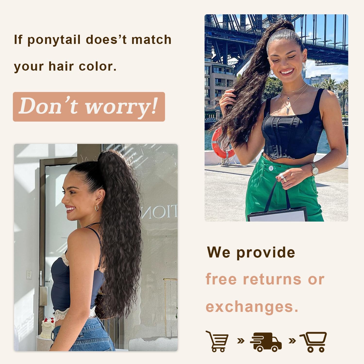 【Easy to Wear】With our ponytail extension, all you do is simply open the claw comb at the top of the ponytail and clip the hair extension over your own bun or ponytail. It takes one step to put our ponytail extension into your hair and is effortless!
