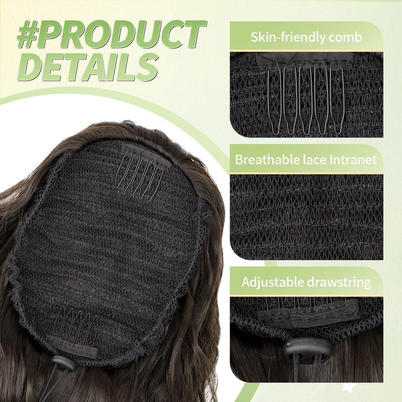 ·[Comfortable and Breathable] The inner net design of this ponytail is soft and breathable, so it won't irritate your skin. It does not tangle or form knots. The hair appears thick and full, curls are soft and bouncy. This is not only a time saver but also comfortable to wear and reusable.·[Excellent Design] The new look incorporates multiple layers into the hair, giving the appearance of being long and thick while actually being quite lightweight. Quickly bulk up your hair without adding weight, and wear it snugly around your head.·[Easy to Wear] You can put on our drawstring ponytail as quickly and easily as you can pull your own hair into a ponytail. If you want to look stunning without tiring yourself, this is your best option.·[Stays in Place] Drawstring ponytail protects you from awkward situations. It features two invisible combs and a high-elastic drawstring construction to keep the ponytail extension in place all day long.·[Untangling Instructions] If the ponytail gets entangled, there is nothing to worry about. Just spray it with water or mousse, separate the strands with your fingers or a comb, and you'll be good to go.